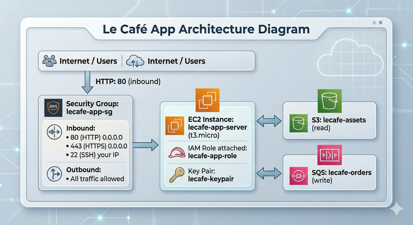 Your mission in this lab is to provision the EC2 infrastructure for that backend service: a key pair for SSH access, a security group that allows only the traffic the application needs, and an EC2 instance attached to the lecafe-app-role you created in Lab 01. By the end, you will have a complete stack โ identity, storage, and compute โ all wired together.