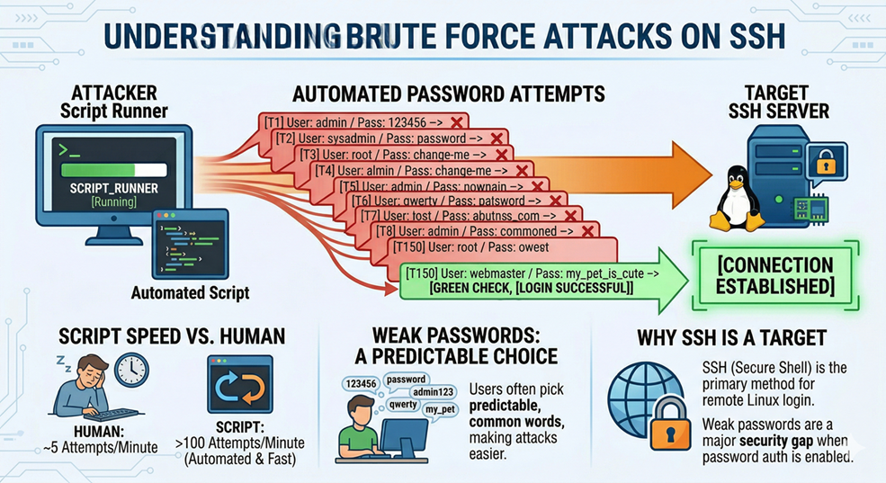 A brute force attack is simple: try many passwords, one after the other, until one works. It succeeds because people choose weak, predictable passwords. Against a server with no protection, a script can try hundreds of passwords per minute — far faster than a human ever could.