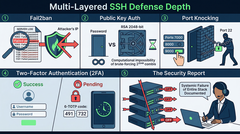 Even if password authentication is enabled, layering it with TOTP (Time-based One-Time Password, as used by Google Authenticator) means that a correct password alone is insufficient to log in. The attacker would also need the current 30-second code from the target’s physical device — which brute forcing cannot provide.