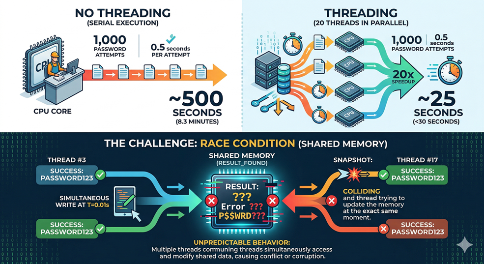 The challenge with threads is that they share memory. If two threads both find the correct password at the same moment, they can both try to write a result at the same time, which causes unpredictable behaviour. This is called a race condition, and you will see how to prevent it.
